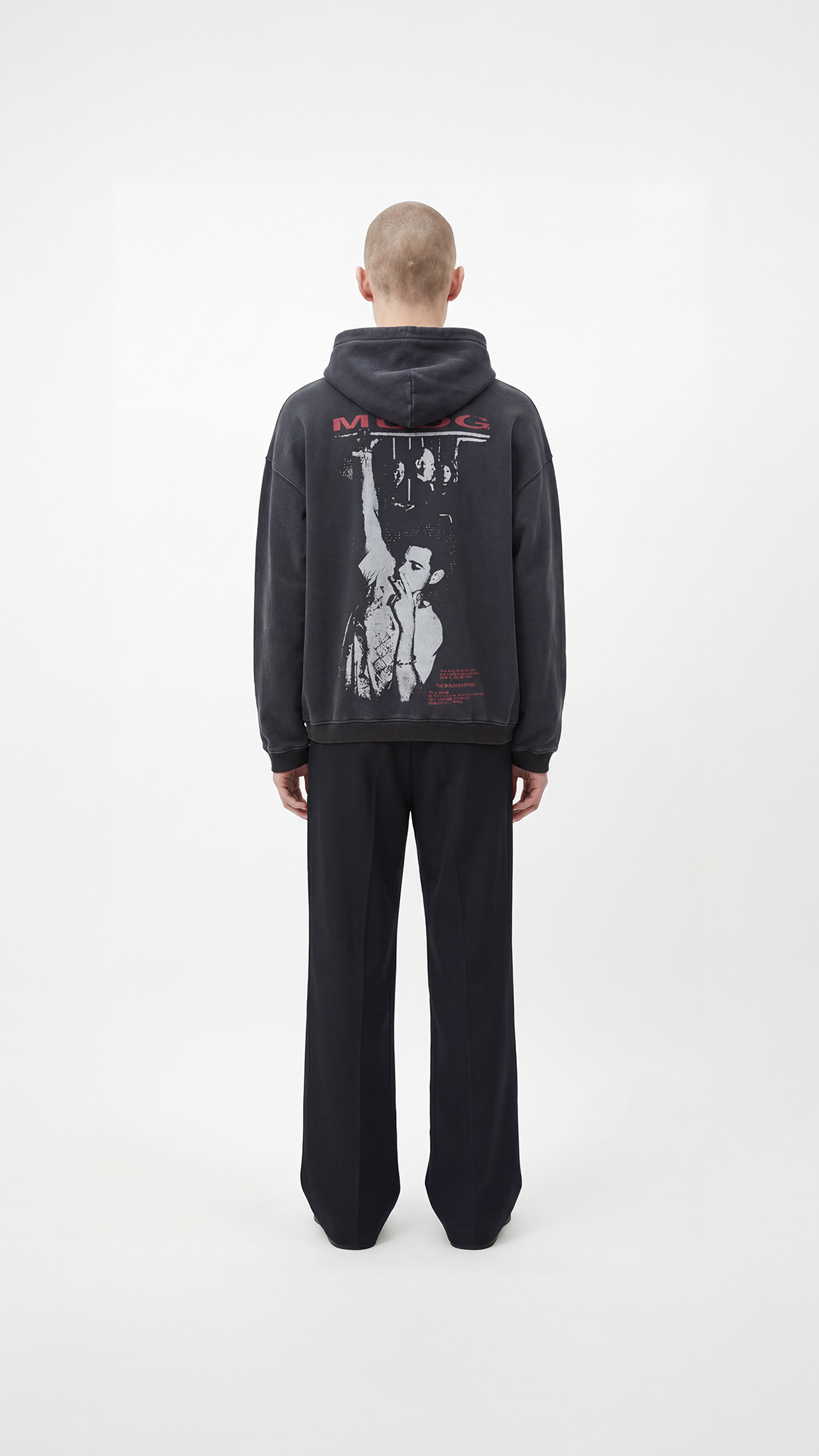This garment features a bold “Bolshoi Friends” back print. The garment has undergone sunfading for a worn-in look. Designed with a boxy silhouette, and heavy hood for a structured yet relaxed fit. Finished with a classic kangaroo pocket.