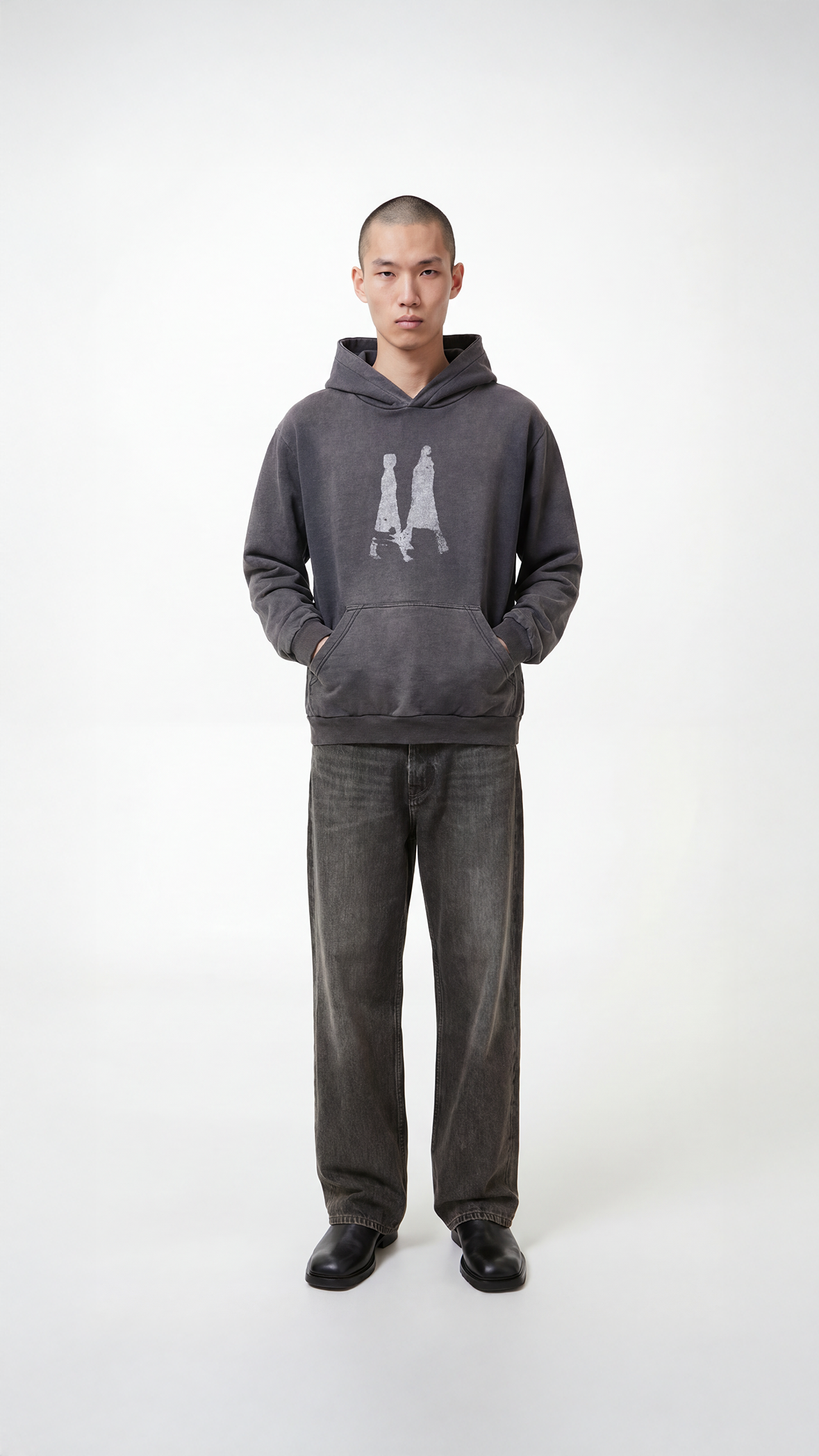 This garment features a 'Walk' chest print, and a reinforced kangaroo pocket. Sun-faded look from numerous days in the Swedish summer sun. It is made with a heavy hood and has cropped, boxy fit with a dropped tail.