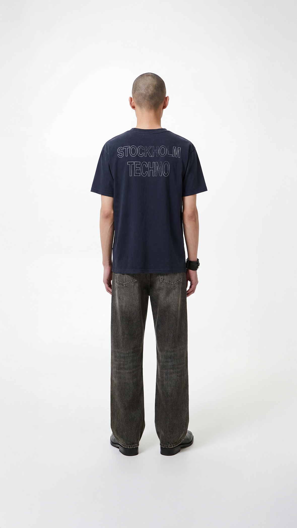 This garment features a outlined cracked ‘Stockholm Techno’ print on the back. Crafted from a selected heavy fabric, it features a distinctive faded blue color and a boxy fit.